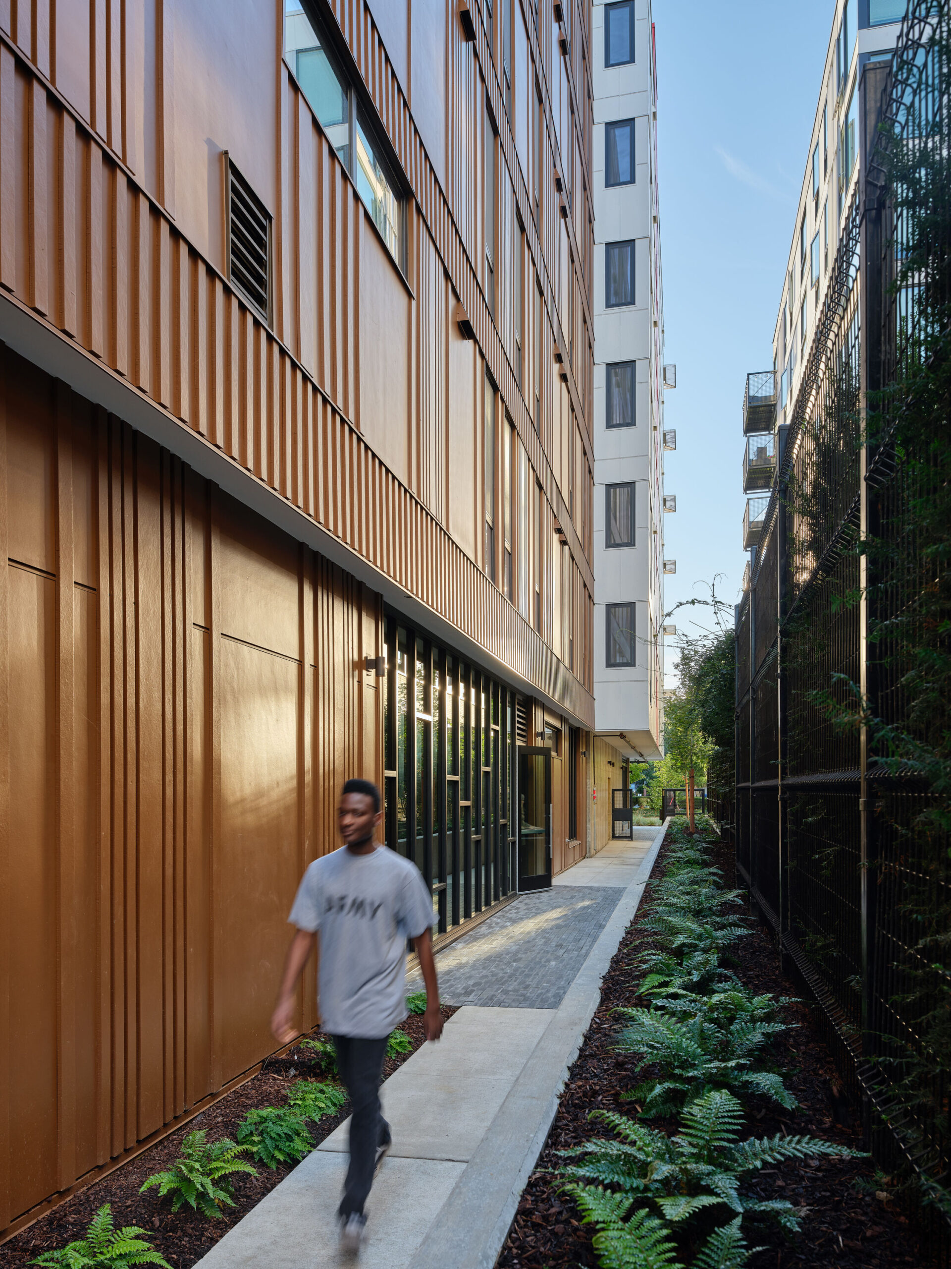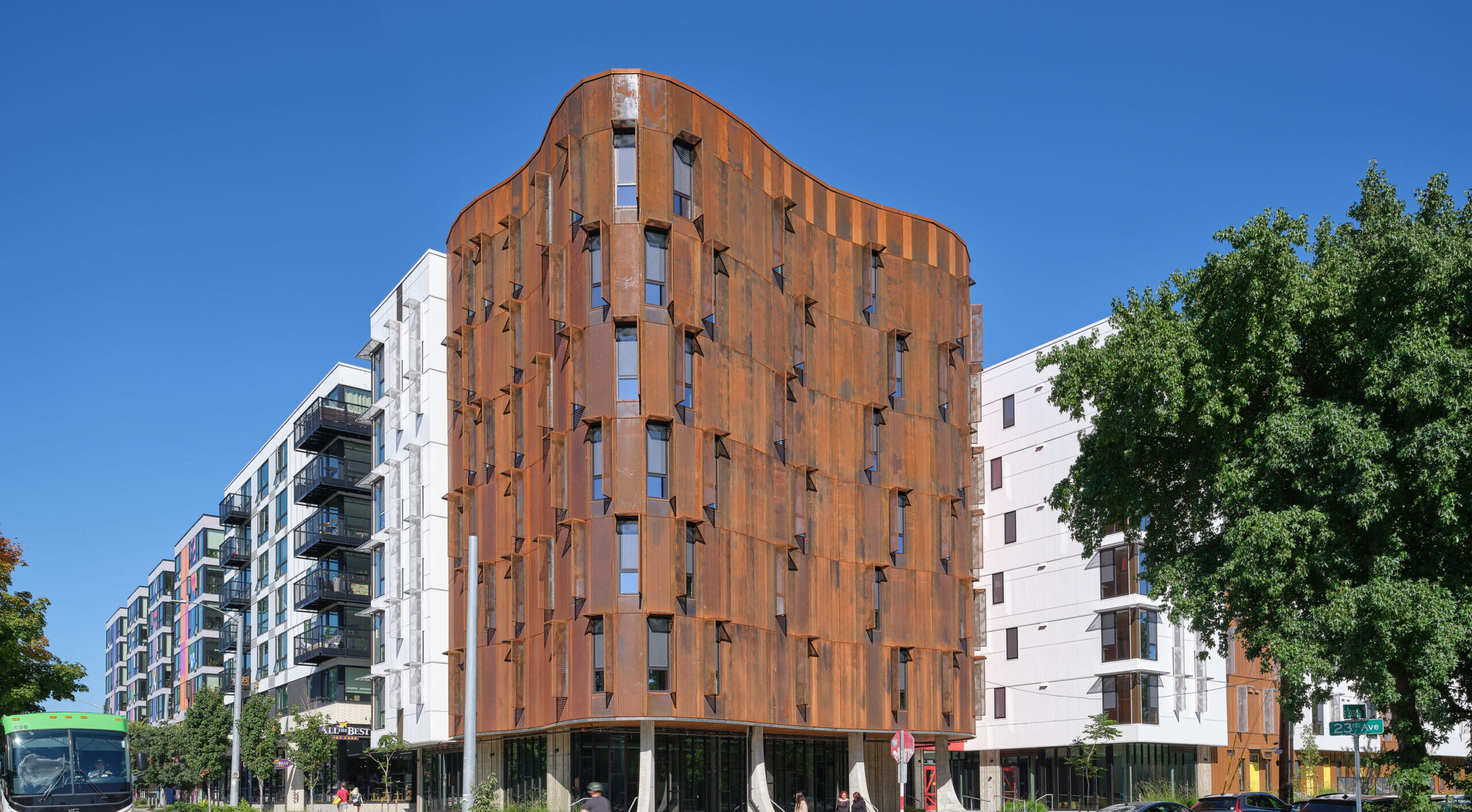 At the southern edge of Seattle’s Central District, Africatown Plaza demonstrates how light-frame wood construction can support affordability and architectural distinction. Designed by David Baker Architects, with GGLO as architect of record, for the Africatown Community Land Trust, the seven-story, 126-unit project translates community vision into built form. Conventional wood framing above a concrete podium keeps costs in check while enabling expressive geometry, including a segmented, curving corner that anchors a new public plaza. The result is housing that resists anonymity while using wood’s economy and flexibility to create welcoming outdoor spaces, social thresholds, and a strong civic identity rooted in place.