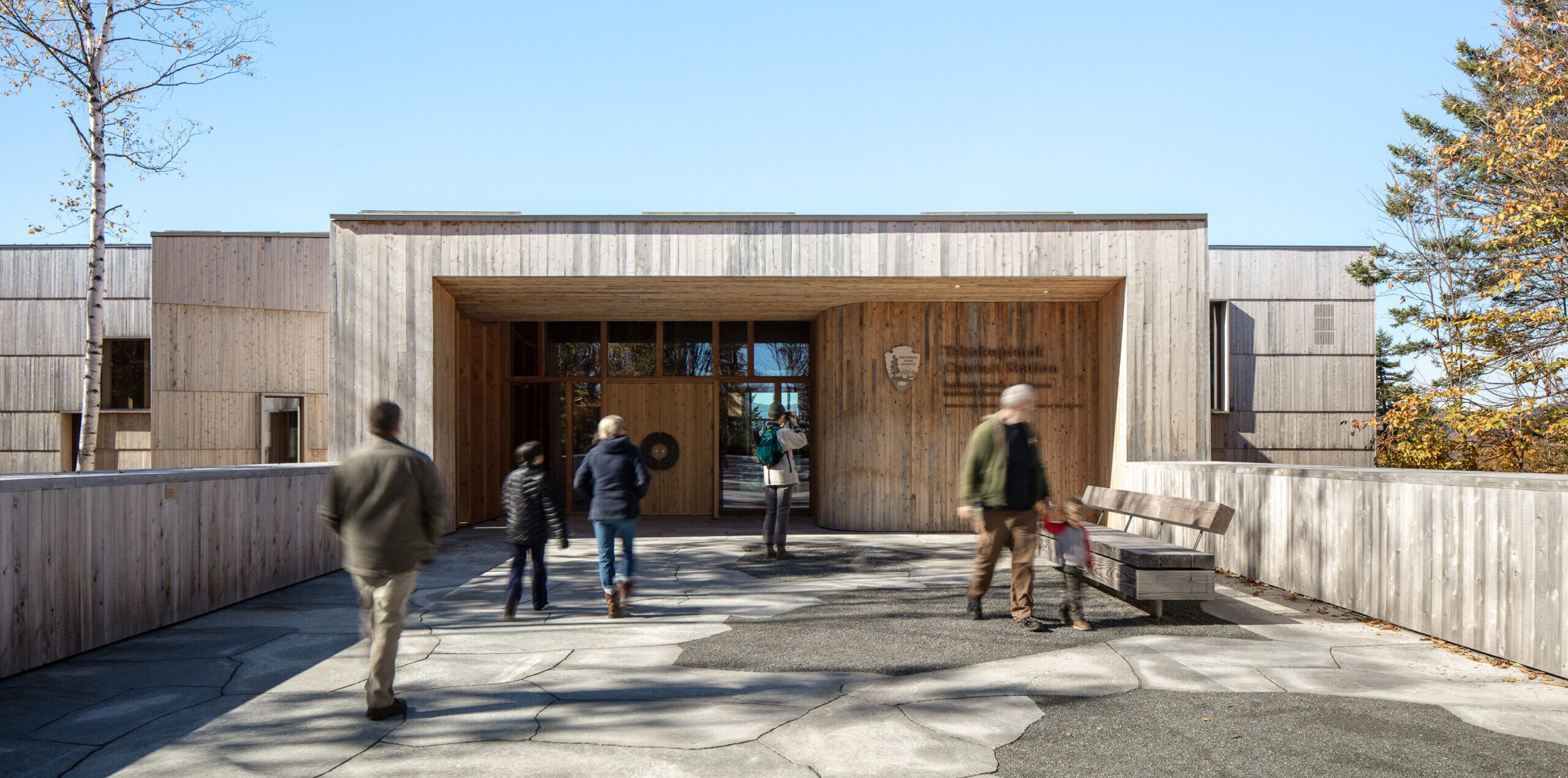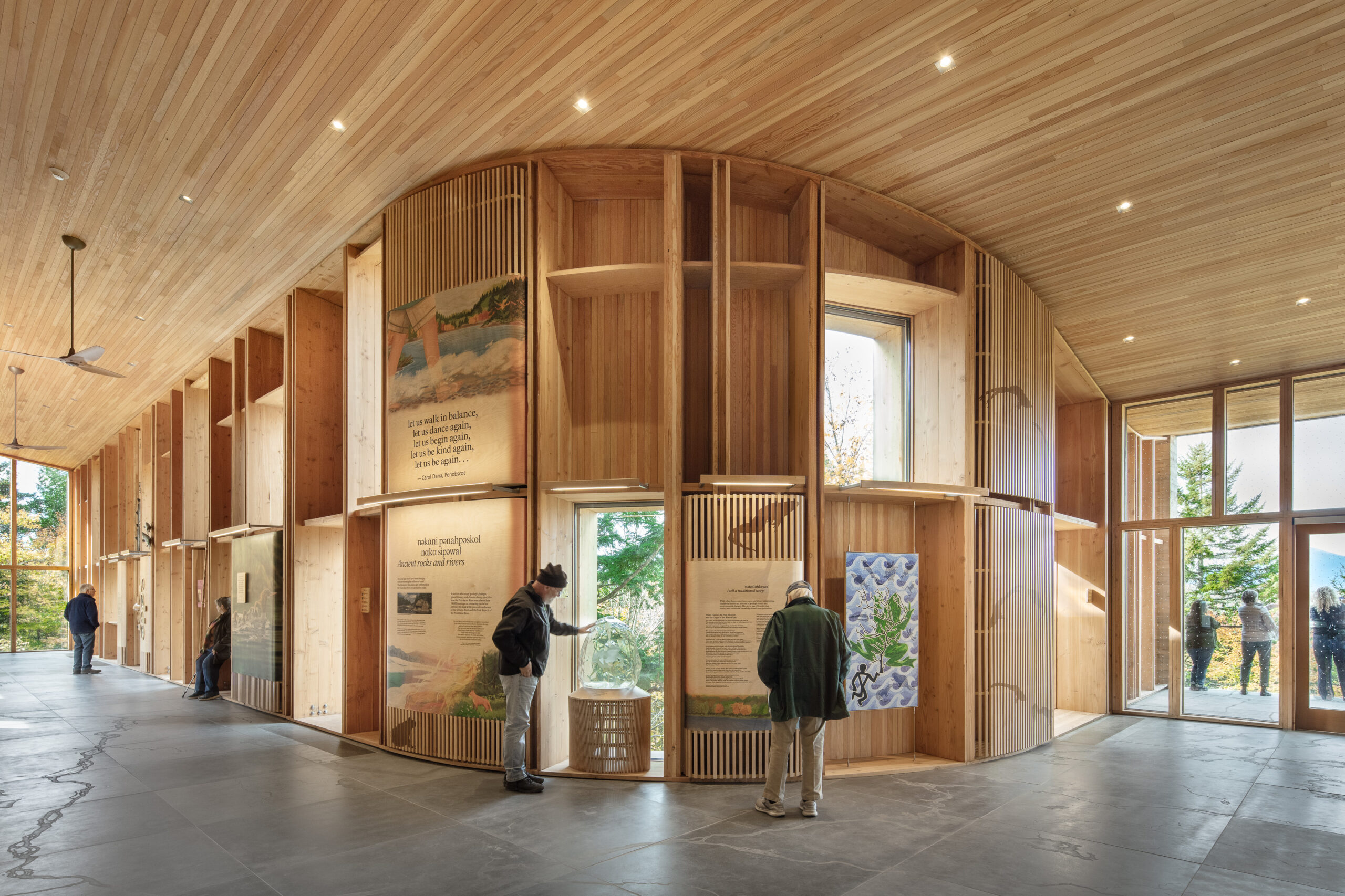 Perched on a ridgeline in Maine’s Katahdin Woods and Waters National Monument, the Tekαkαpimək Contact Station demonstrates how mass timber can shape place, meaning, and experience. Designed by Saunders Architecture with Alisberg Parker Architects as architect of record, the nearly all-wood structure was developed in close collaboration with the Wabanaki Advisory Board. CLT floor slabs, custom glulam columns and beams, and locally sourced cedar and fir create a building that feels suspended within the forest while anchored directly to bedrock. Operating largely off-grid through passive strategies and solar power, the contact station goes beyond orientation and wayfinding—serving as a cultural gathering place that embeds Indigenous stories, stewardship, and Maine’s timber legacy directly into its architecture.