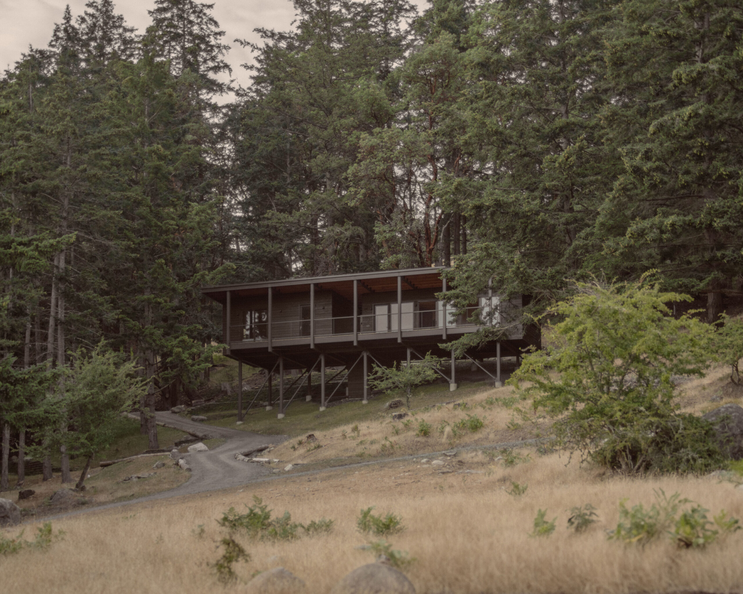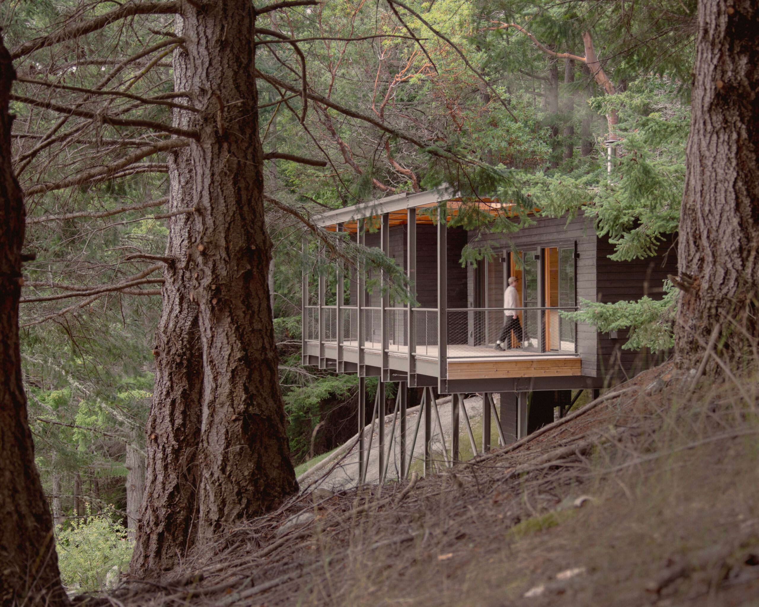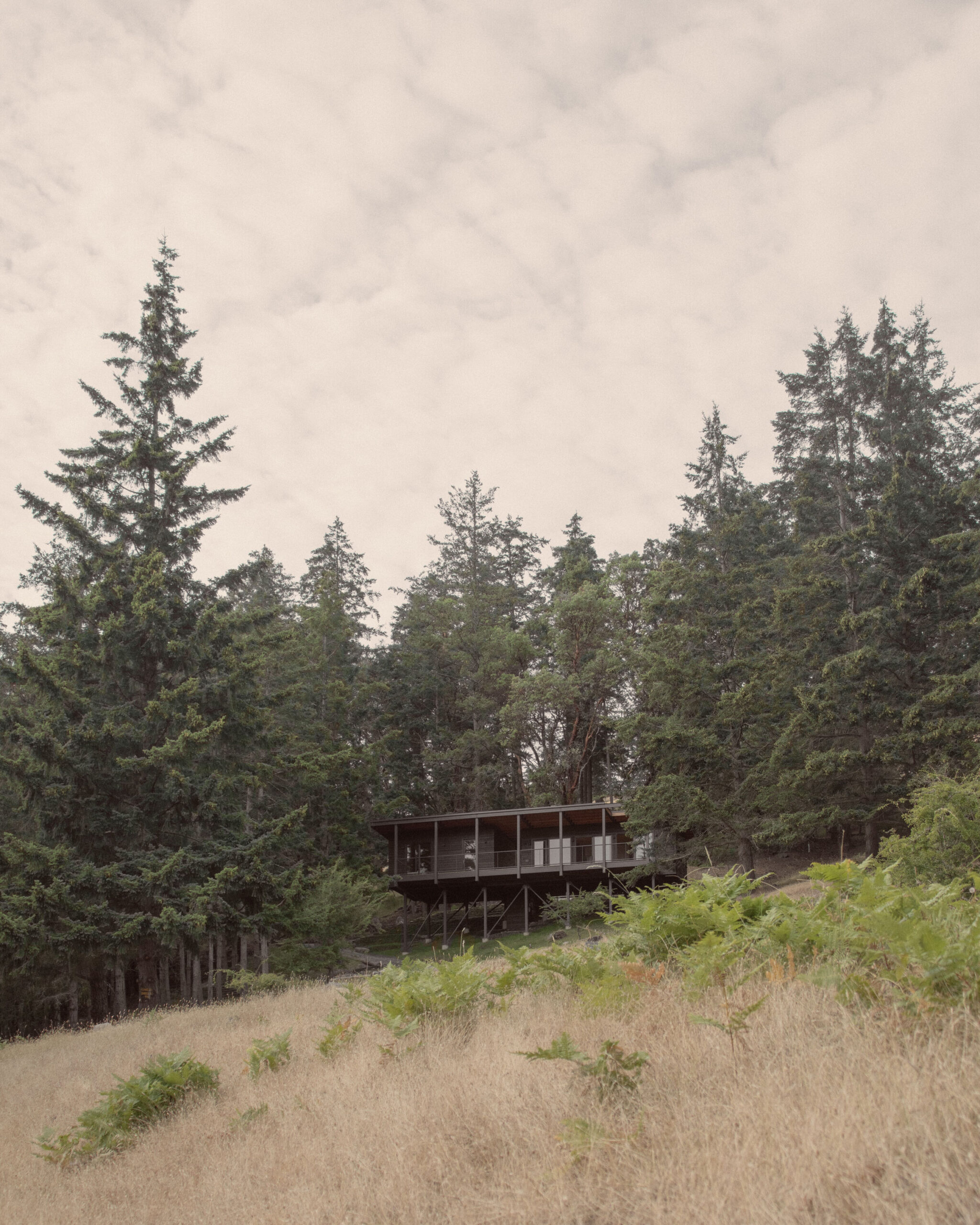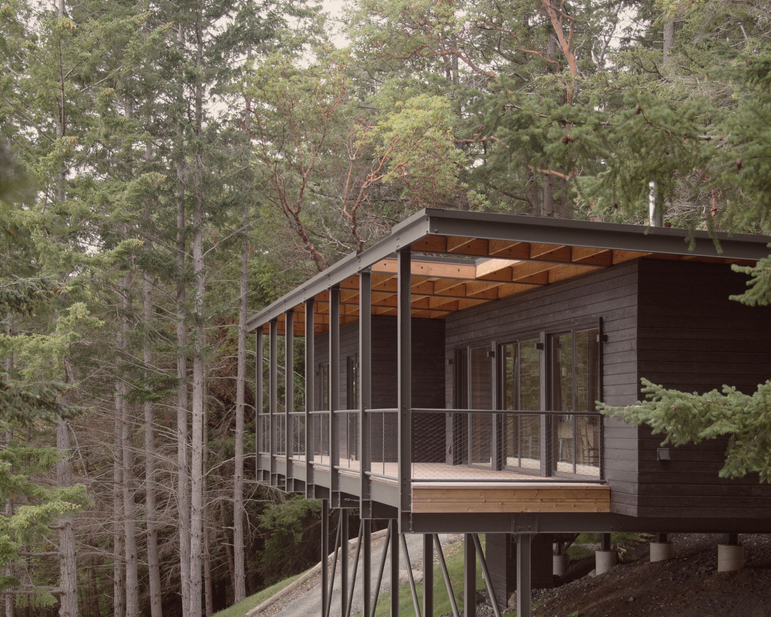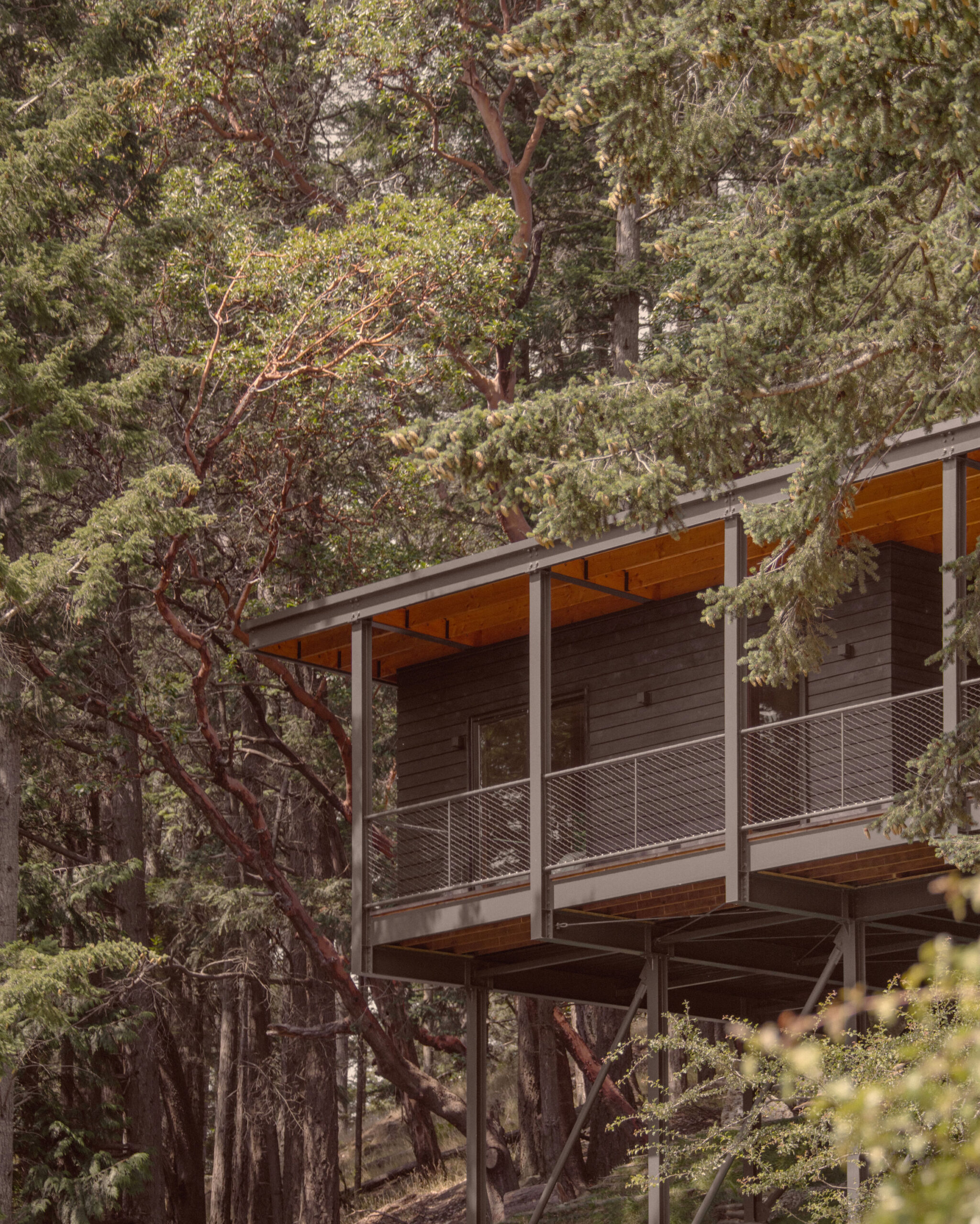 The clients have owned the property on Decatur Island for almost 20 years and have studied the southwest-facing site carefully. Decatur Island is a remote island in the Salish Sea, about 70 miles north of Seattle. Challenging site access—all of the building materials had to be brought over by boat—and the desire to preserve the steep sloping natural grade resulted in a scheme that suspends two living enclosures above the site within the canopy of madrona and fir trees, which was made feasible by the wood’s lightweight nature and ease of handling.