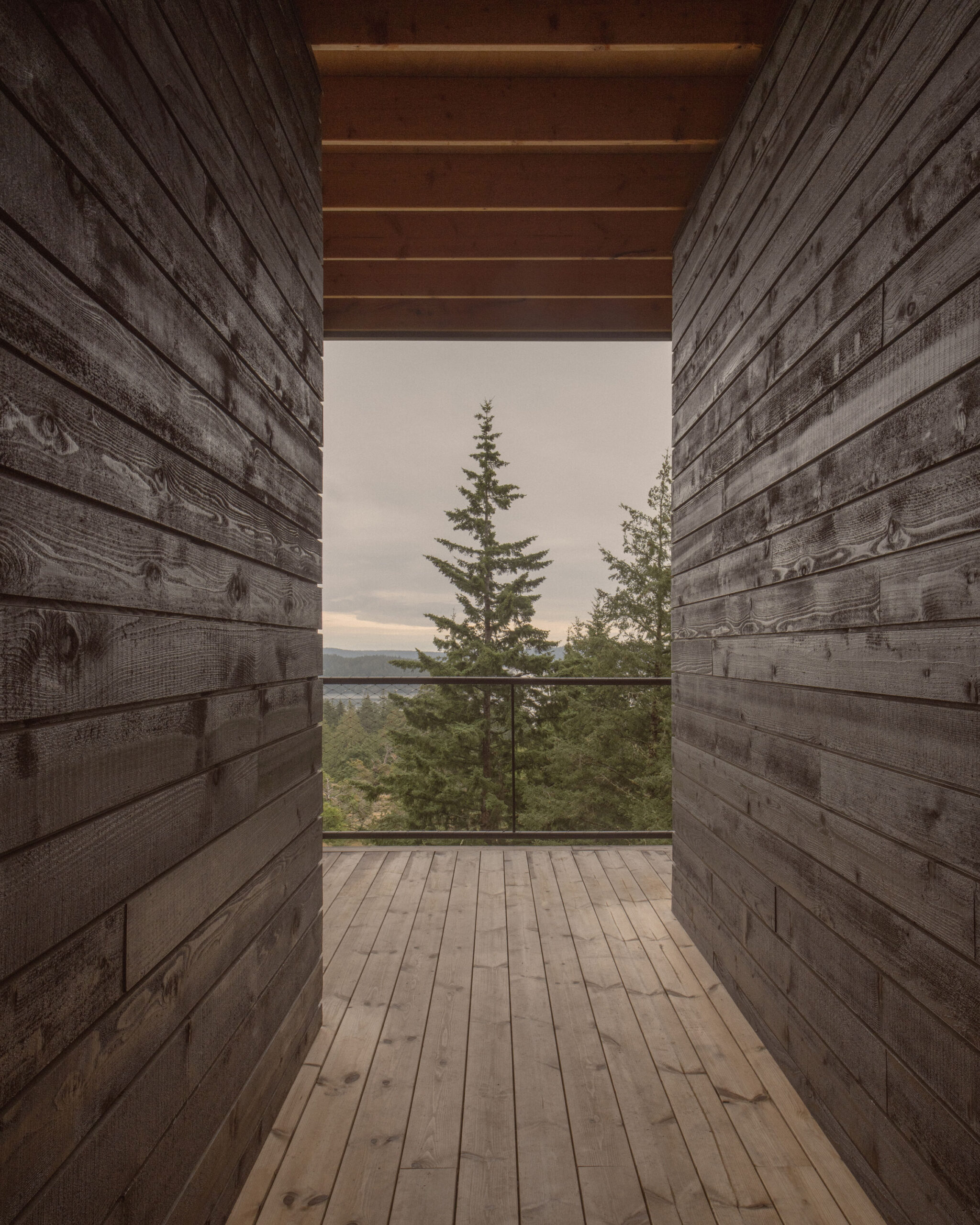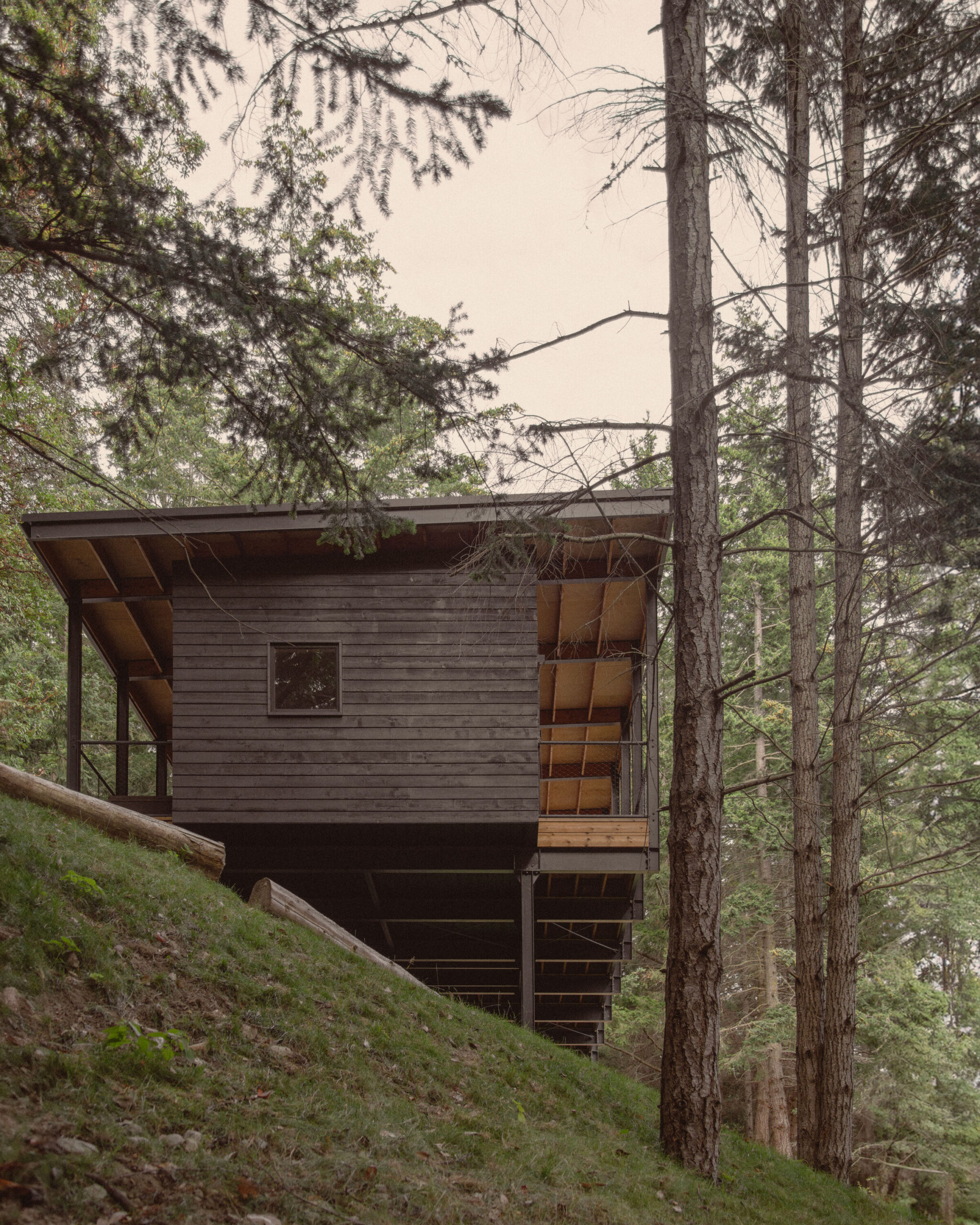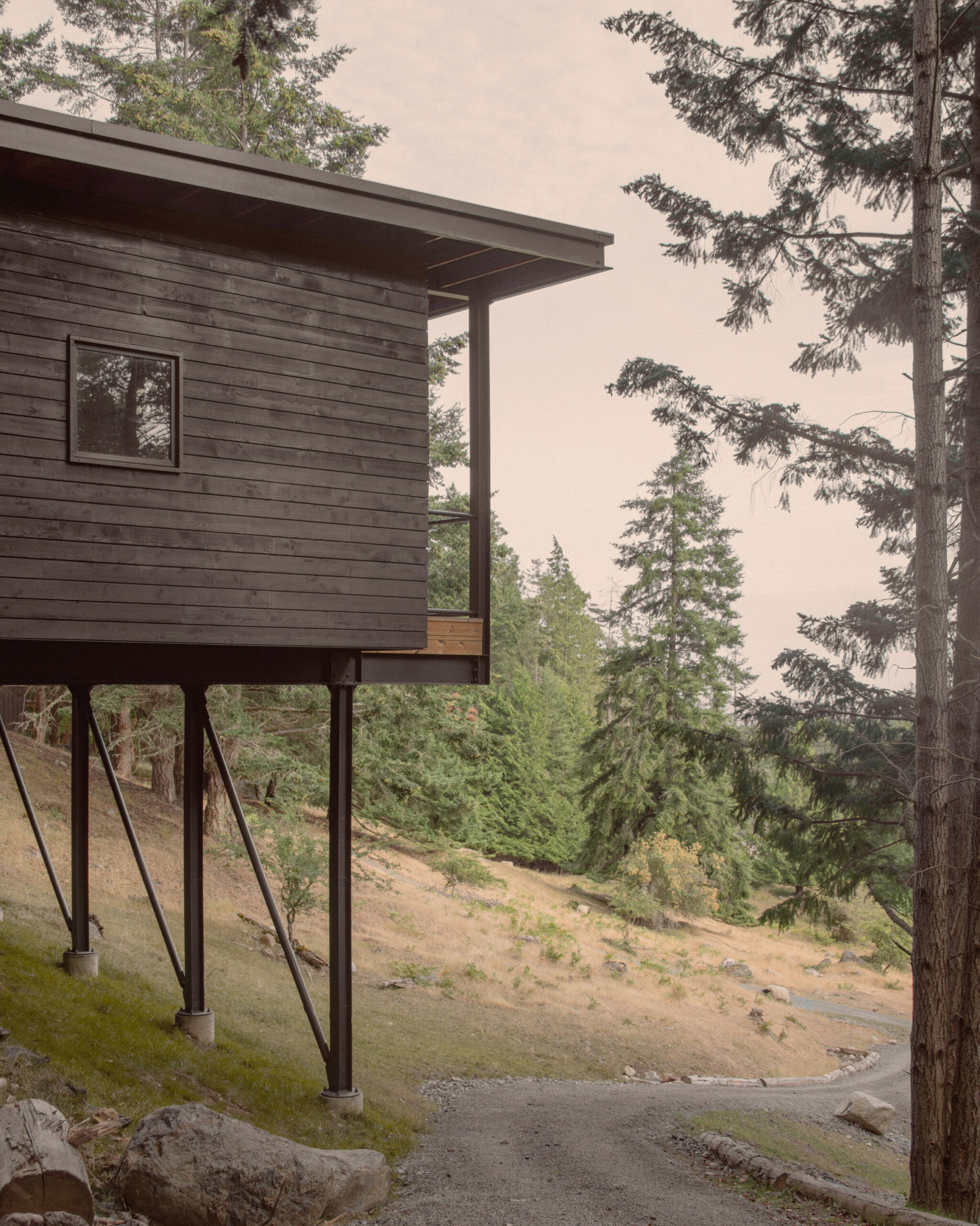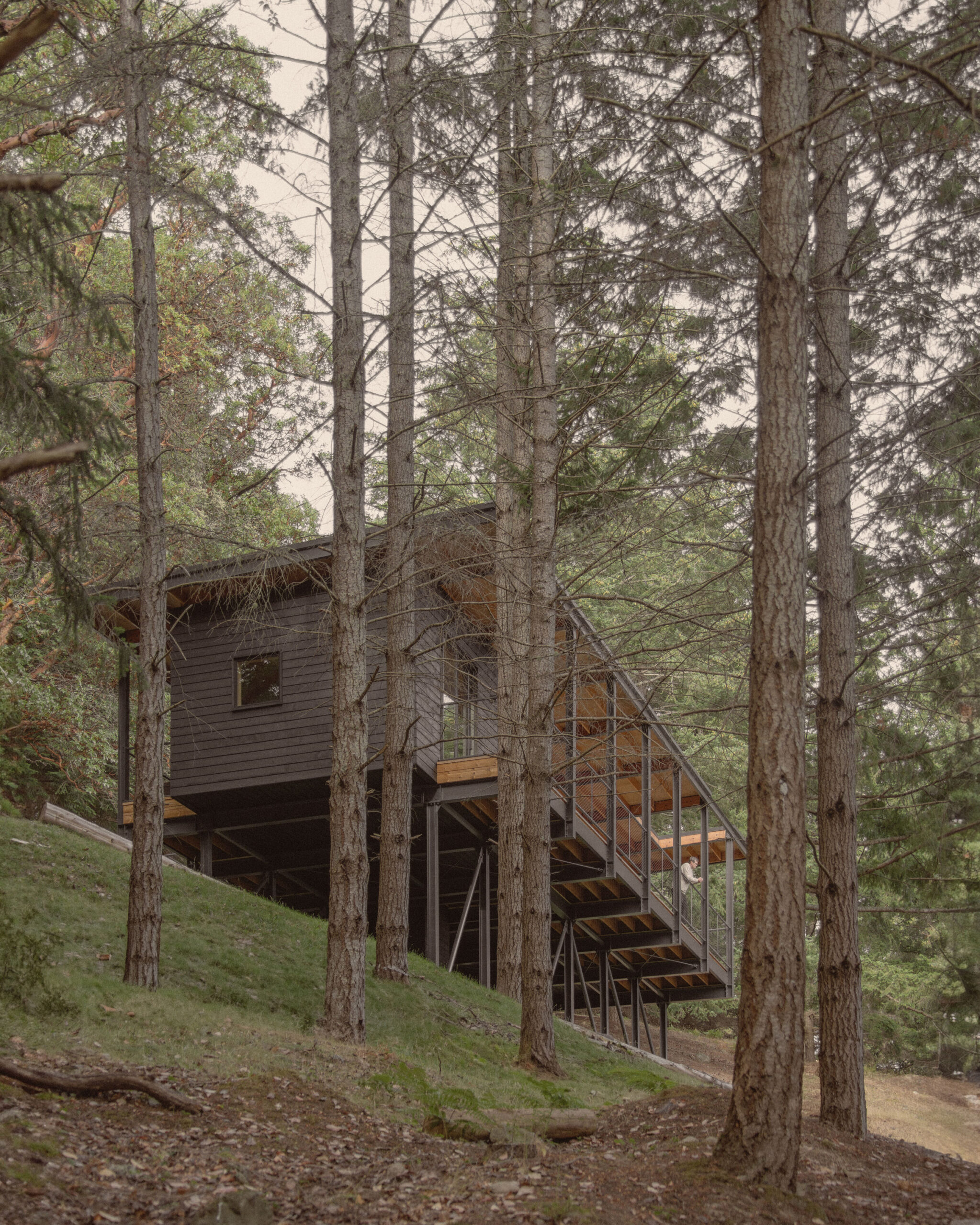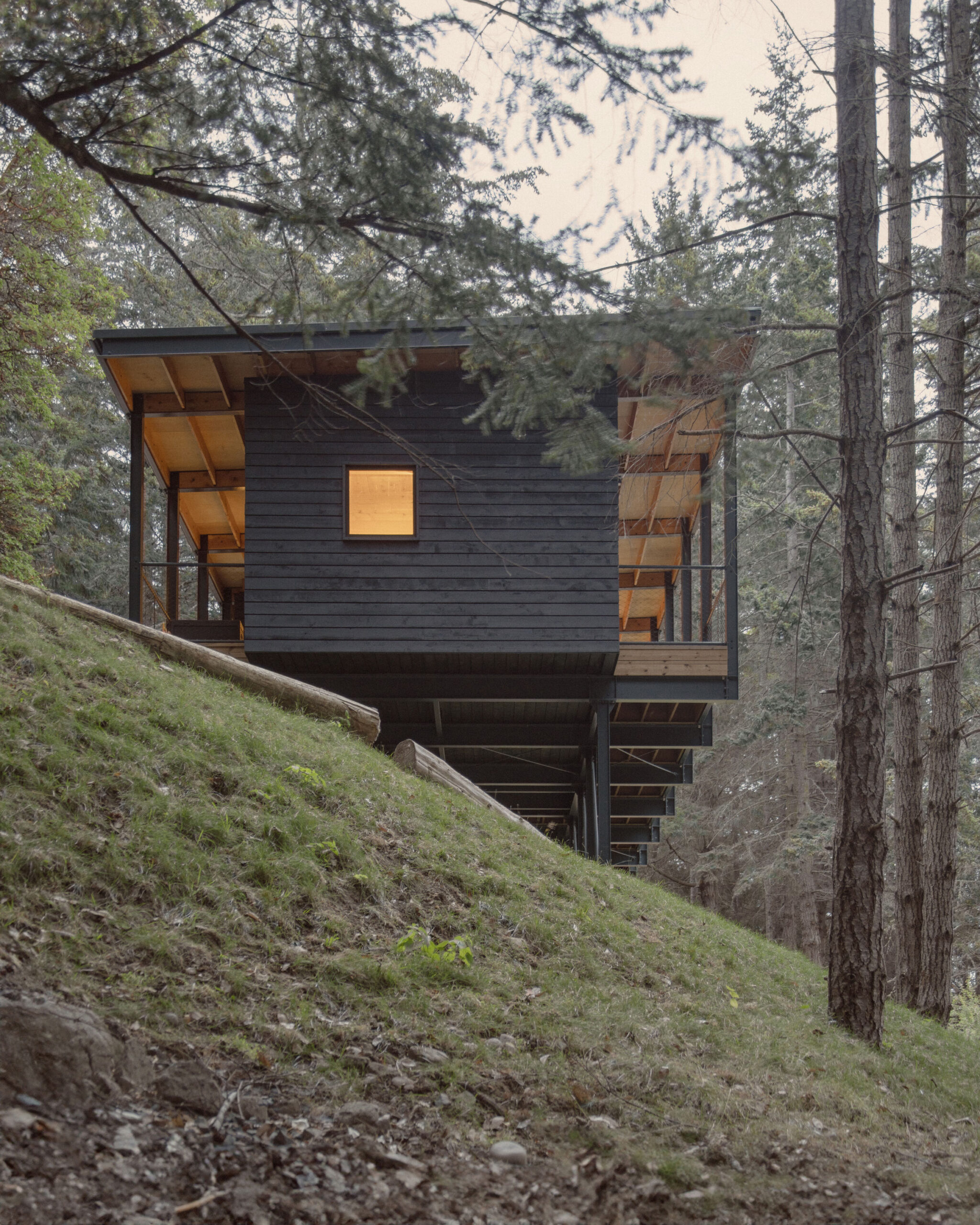 The clients have owned the property on Decatur Island for almost 20 years and have studied the southwest-facing site carefully. Decatur Island is a remote island in the Salish Sea, about 70 miles north of Seattle. Challenging site access—all of the building materials had to be brought over by boat—and the desire to preserve the steep sloping natural grade resulted in a scheme that suspends two living enclosures above the site within the canopy of madrona and fir trees, which was made feasible by the wood’s lightweight nature and ease of handling.