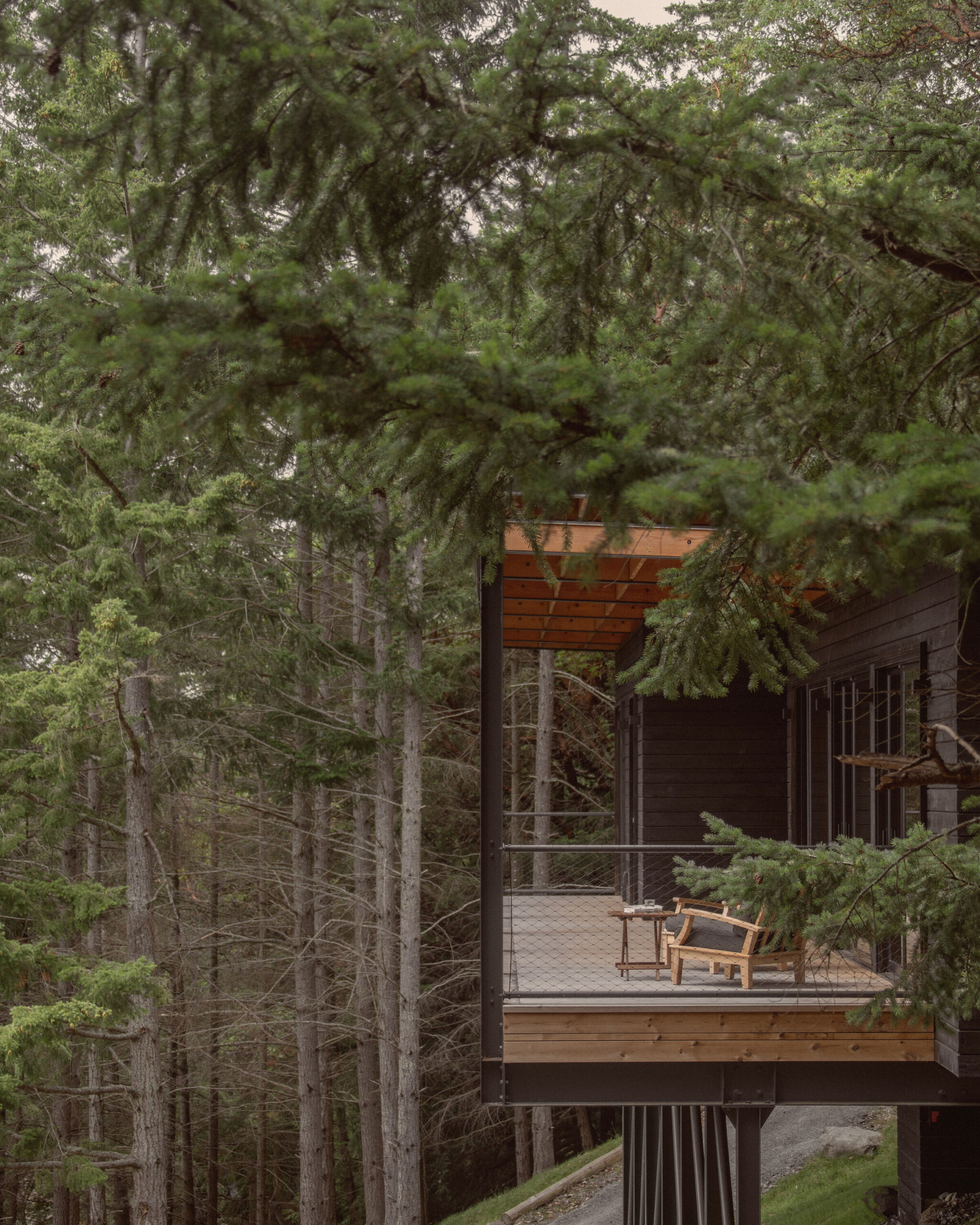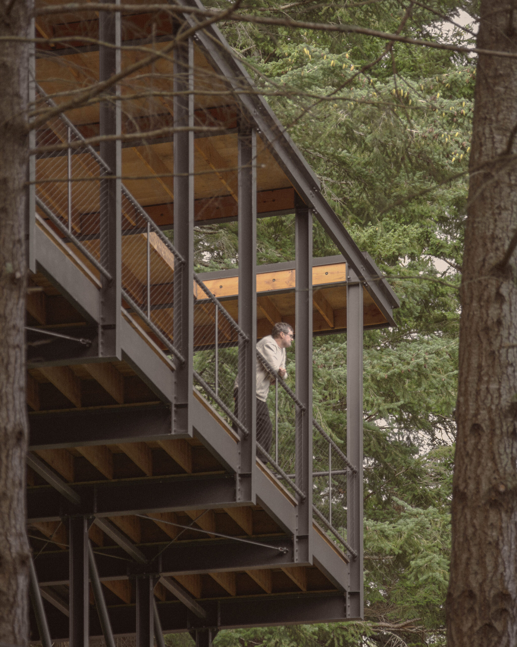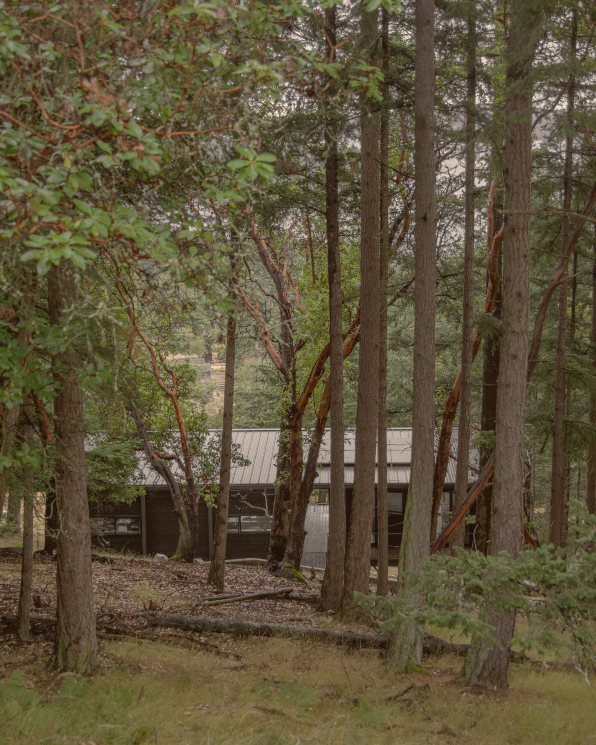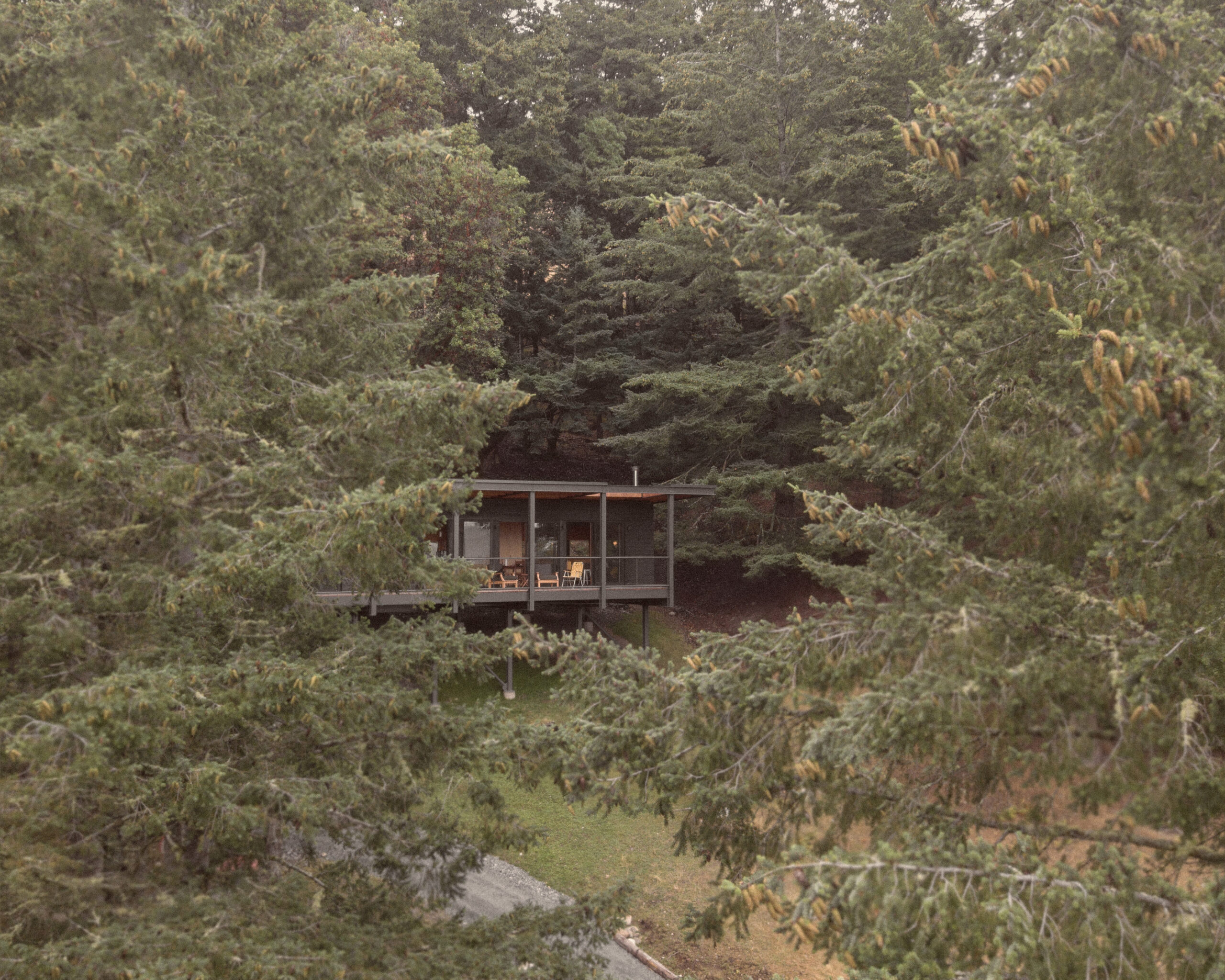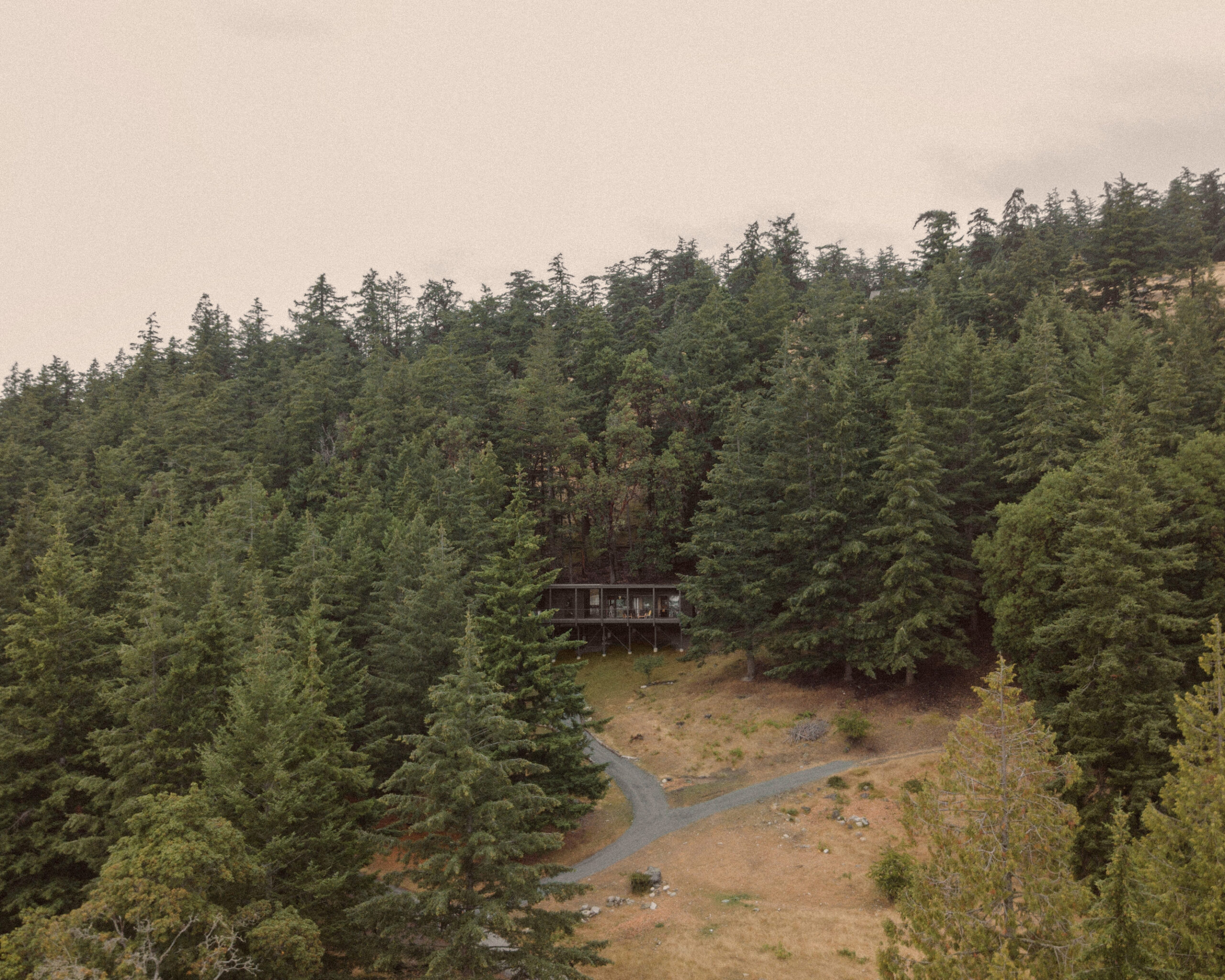 The clients have owned the property on Decatur Island for almost 20 years and have studied the southwest-facing site carefully. Decatur Island is a remote island in the Salish Sea, about 70 miles north of Seattle. Challenging site access—all of the building materials had to be brought over by boat—and the desire to preserve the steep sloping natural grade resulted in a scheme that suspends two living enclosures above the site within the canopy of madrona and fir trees, which was made feasible by the wood’s lightweight nature and ease of handling.