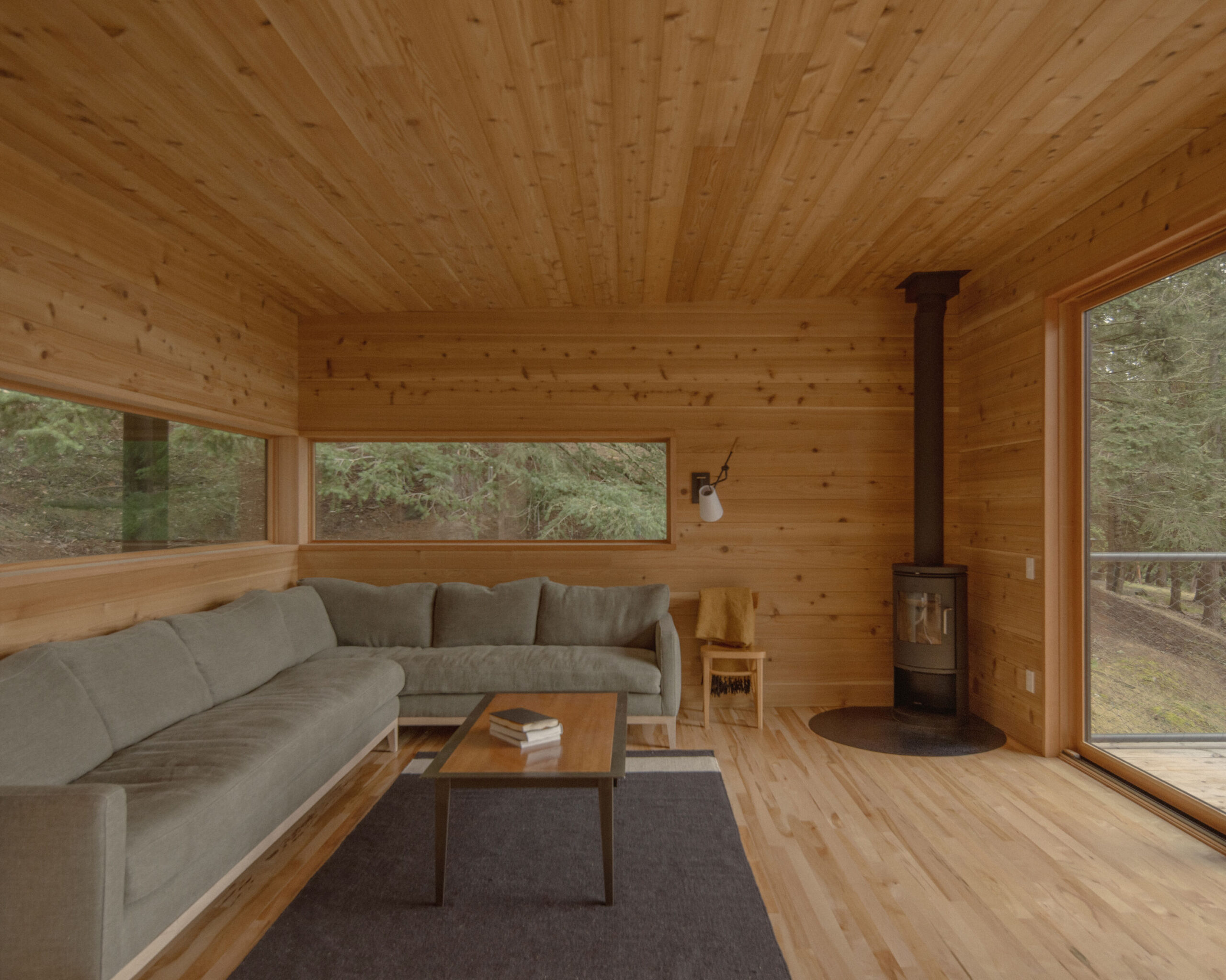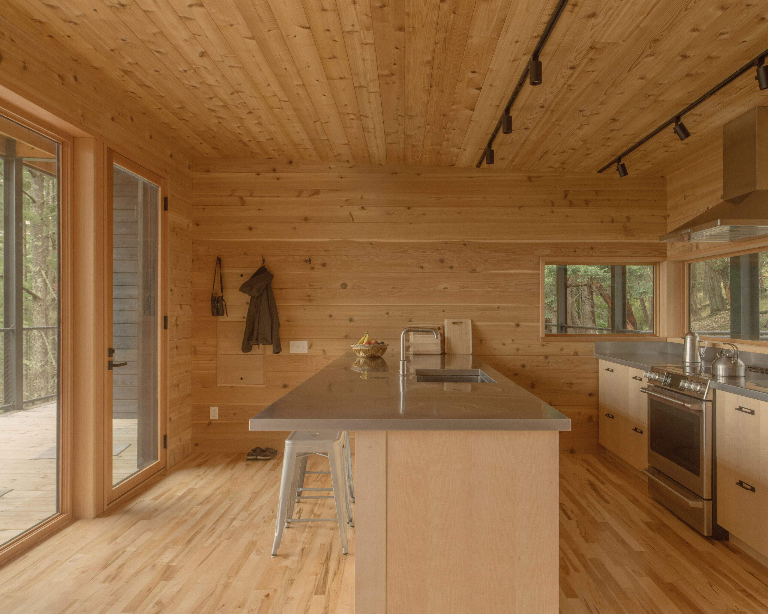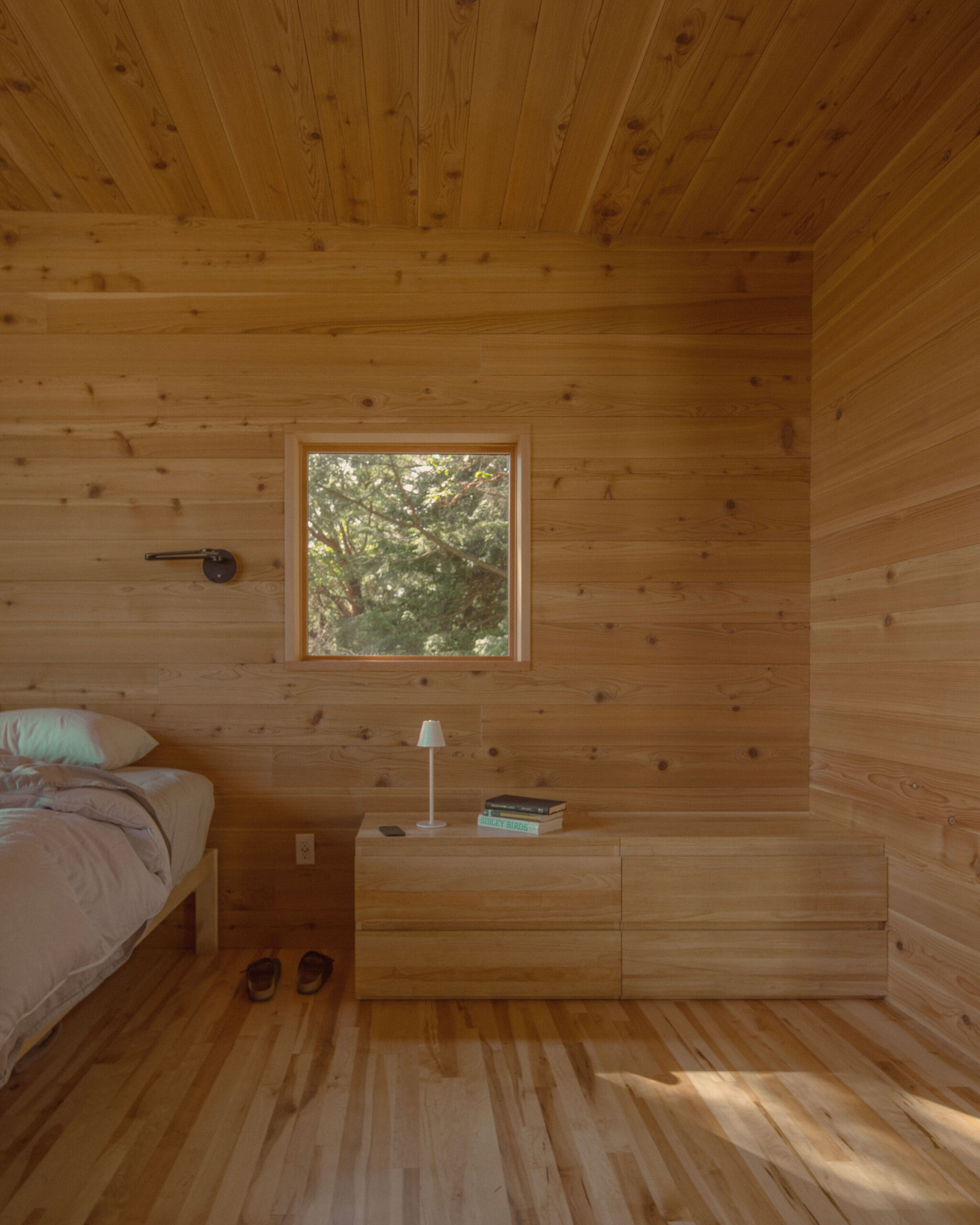Beyond the supporting structure, the goal was to create a warm and welcoming retreat on the wind-swept island—while still maintaining a light touch. One strategy to conserve construction—to reduce materials, cost, and environmental impact—was to separate the living and sleeping spaces, connecting them with unconditioned, exterior circulation. The enclosed living spaces, dubbed modules, are built with light-frame Douglas fir and clad—inside and out—with cedar. Cedar sourced from the Cascades and milled locally in Edison, Washington, wraps each module, providing durability and a clear material tie to the region. “You get this really nice contrast between a dark cabin that recedes into the forest and then when you get inside, it’s this warm, saturated, cozy experience,” Mattheis says.
