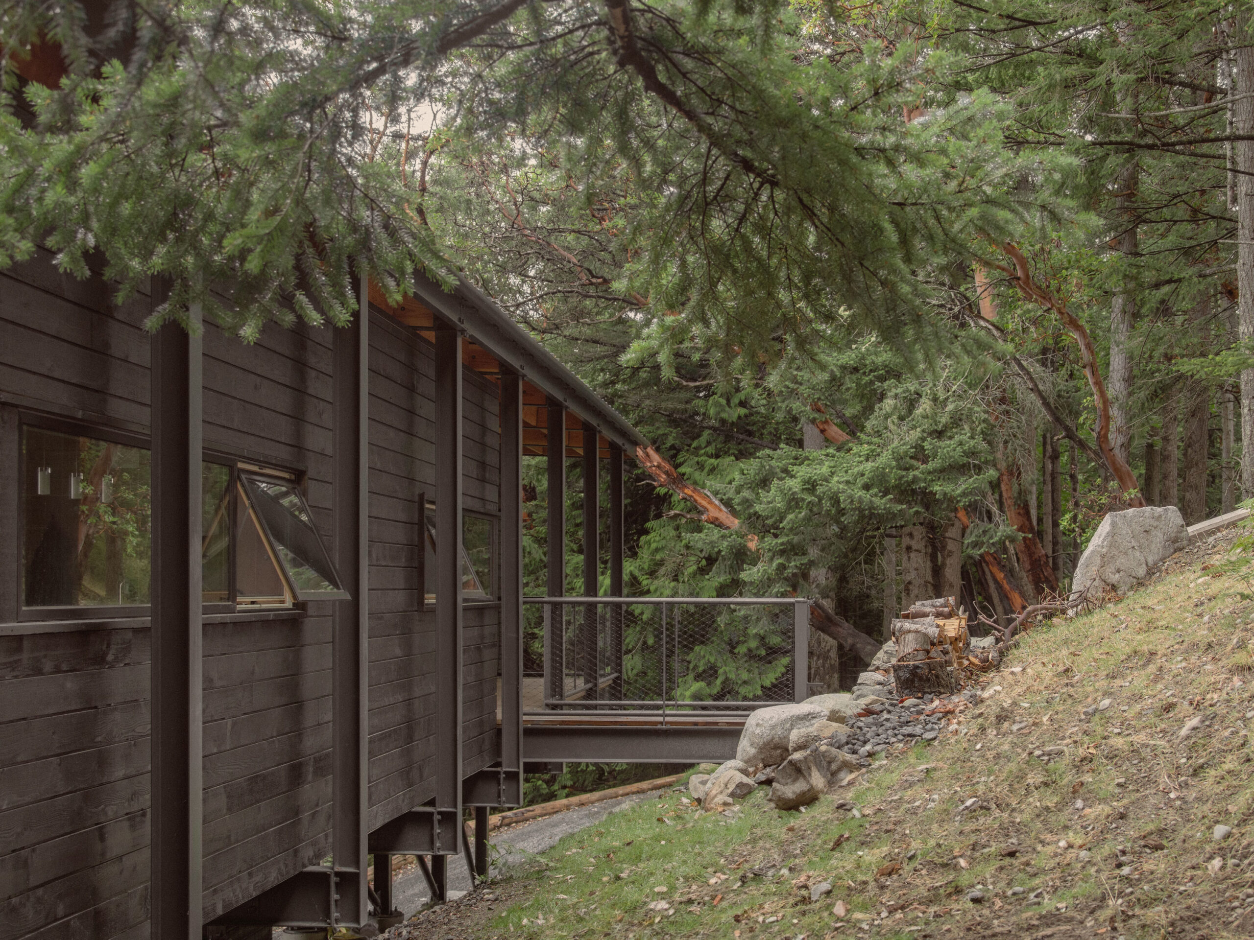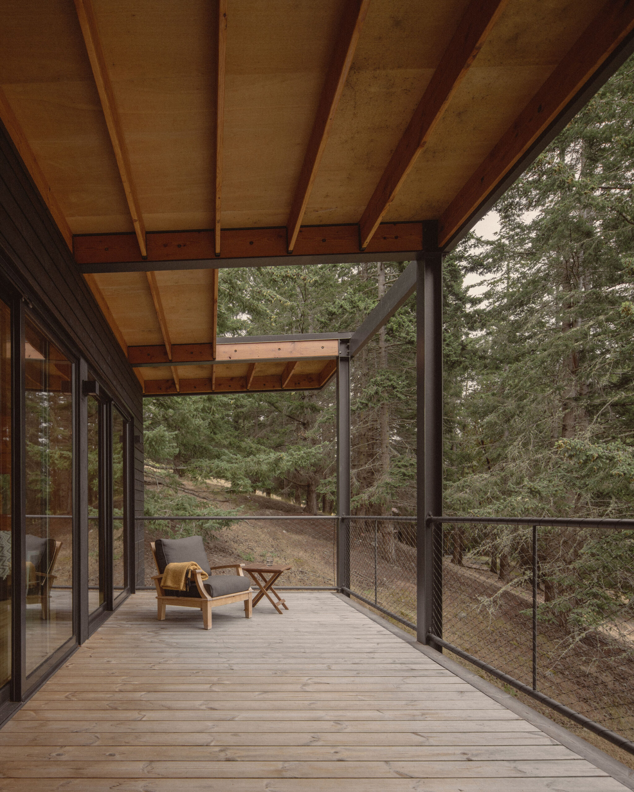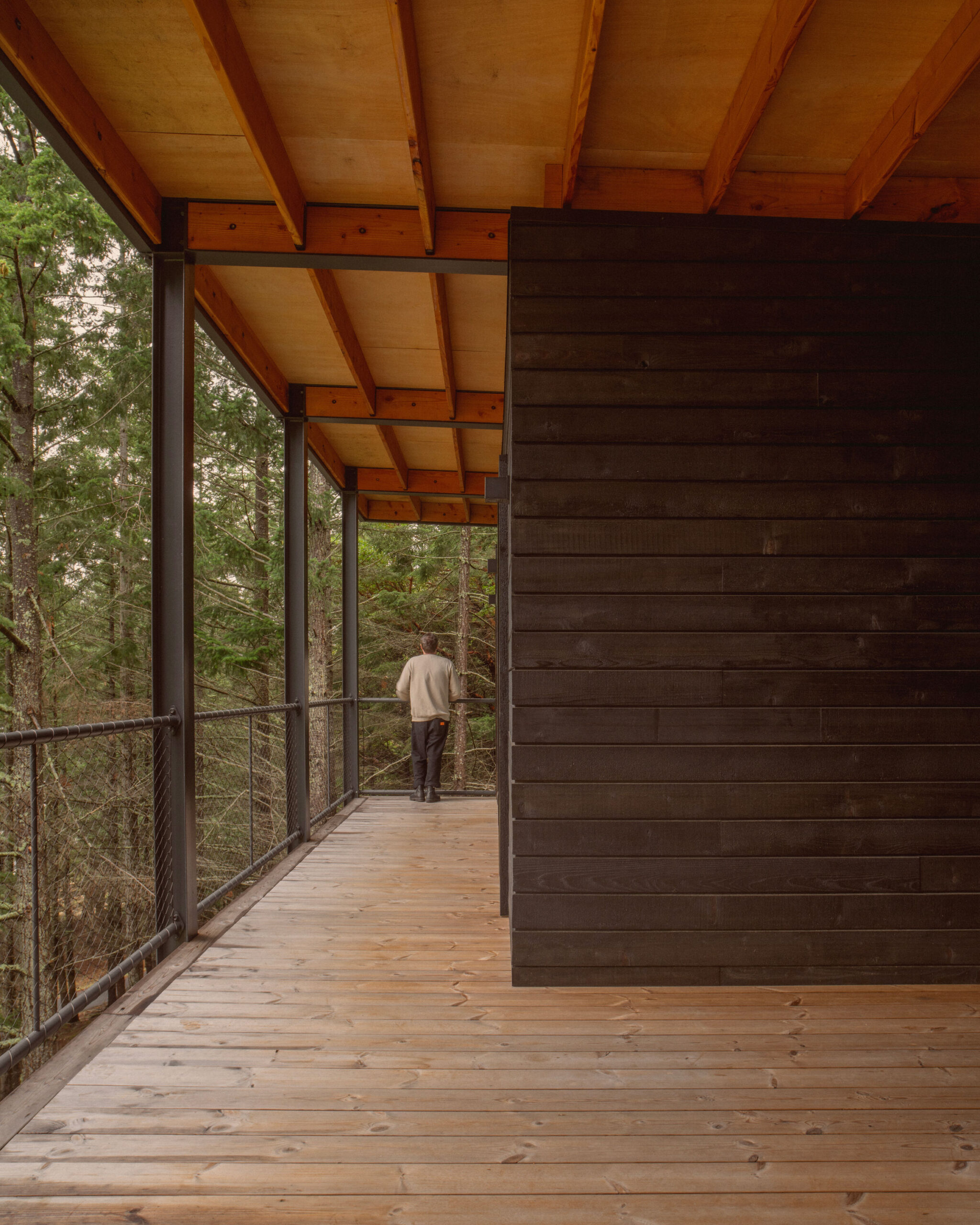 Miller Hull approaches all its cabin projects with the goal of reducing consumption. “We’re interested in doing the sort of minimum footprint that we can,” Mattheis says. By separating the living spaces from the sleeping spaces and having exterior circulation between those, there are no interior corridors as part of the thermal enclosure. “[The] covered outdoor space allows the owner to engage with this site and the weather and the elements on a frequent basis.”