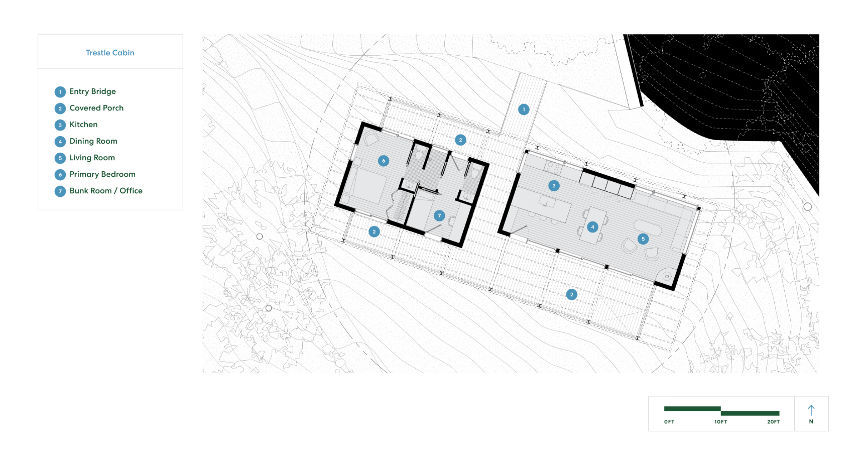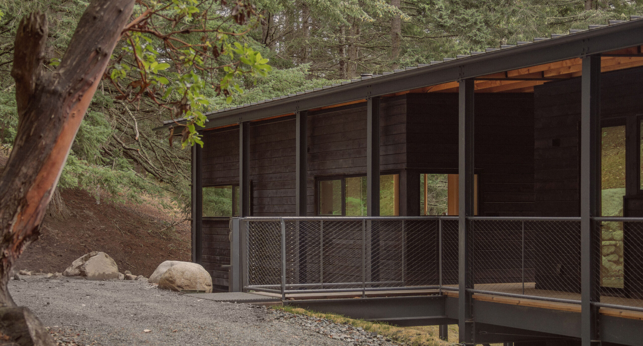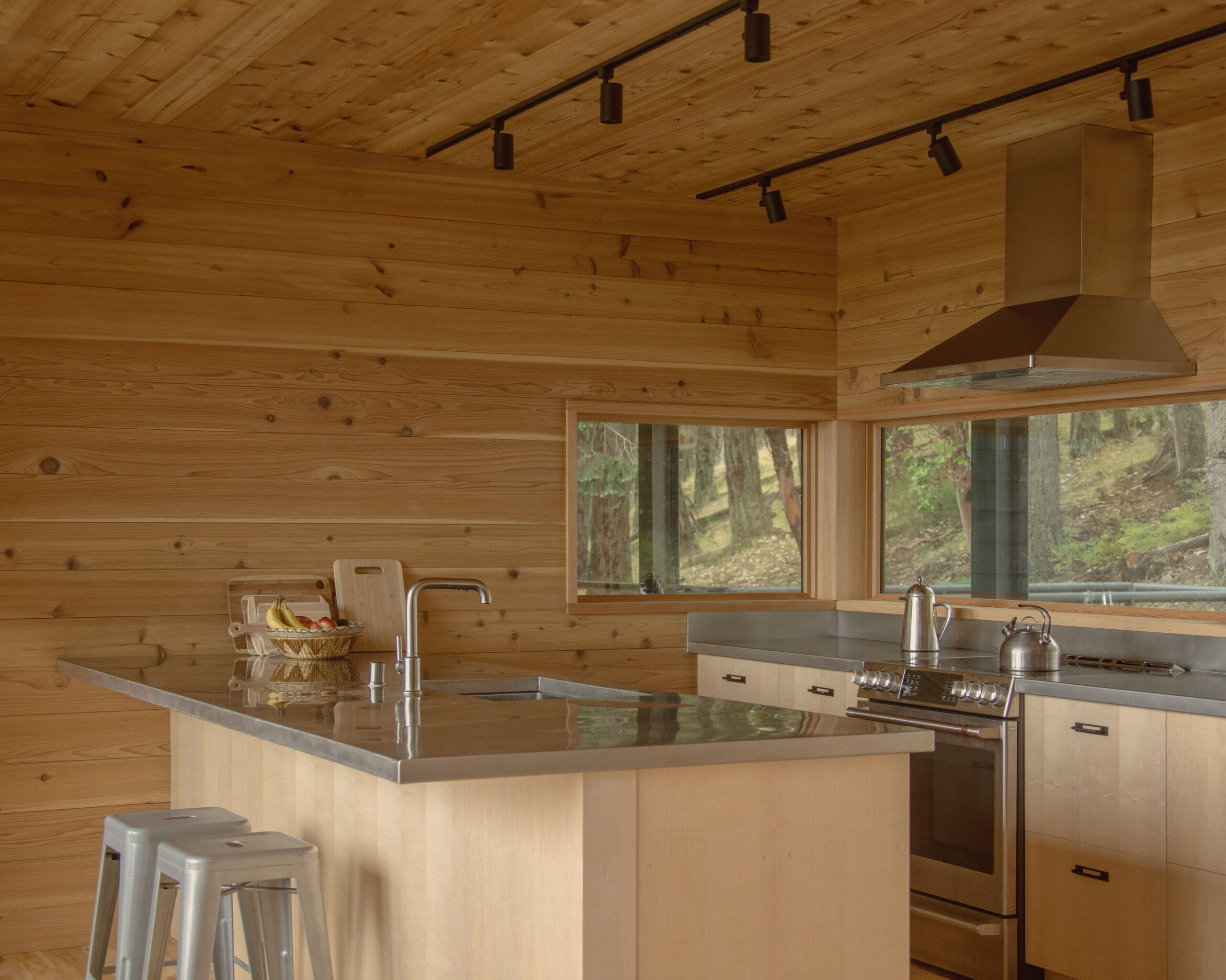 Miller Hull approaches all its cabin projects with the goal of reducing consumption. “We’re interested in doing the sort of minimum footprint that we can,” Mattheis says. By separating the living spaces from the sleeping spaces and having exterior circulation between those, there are no interior corridors as part of the thermal enclosure. “[The] covered outdoor space allows the owner to engage with this site and the weather and the elements on a frequent basis.”