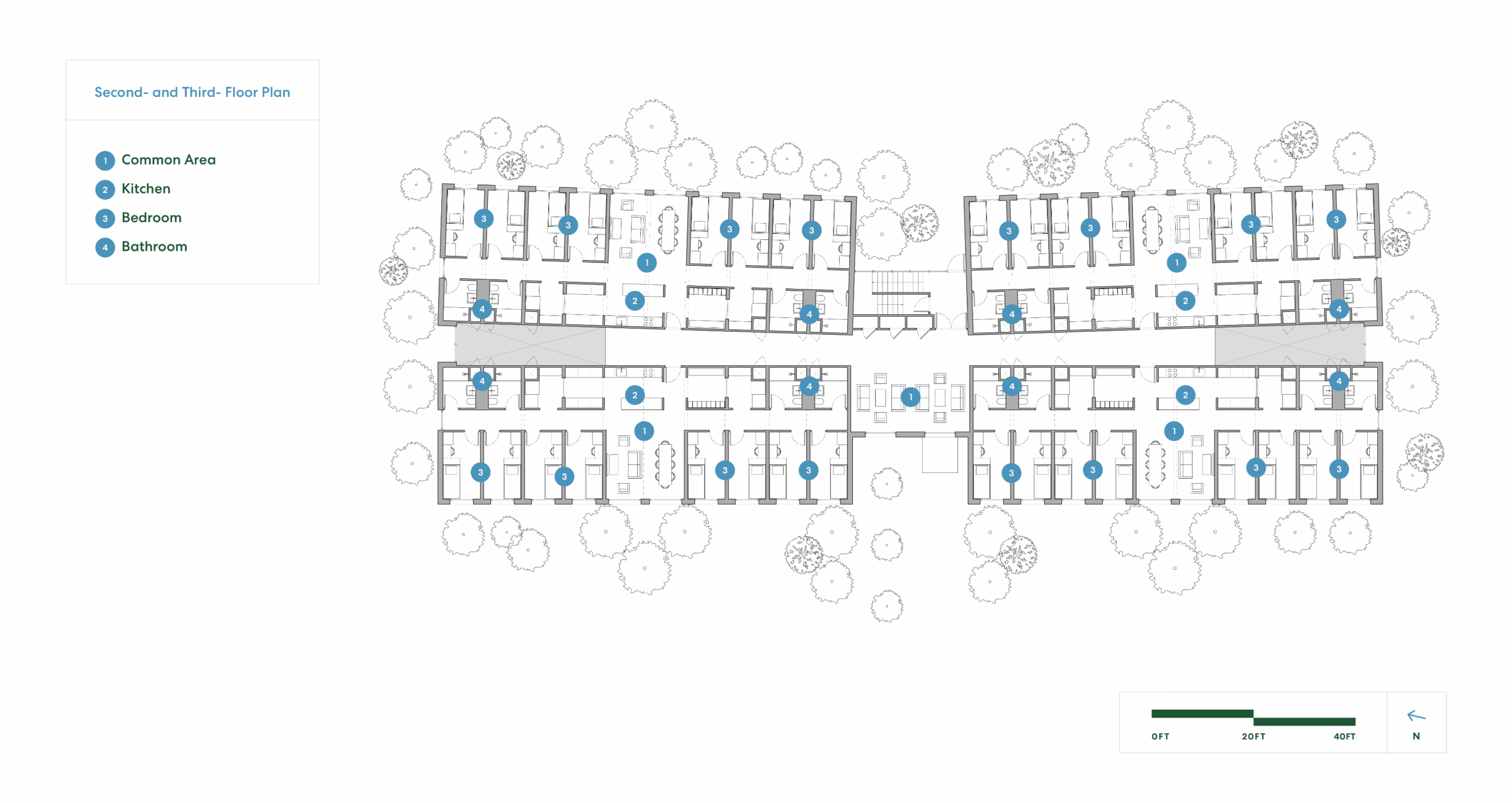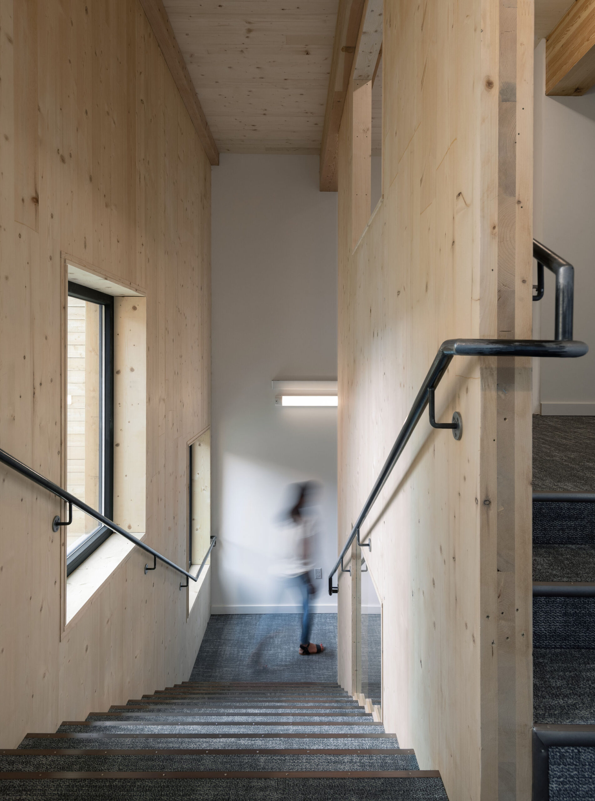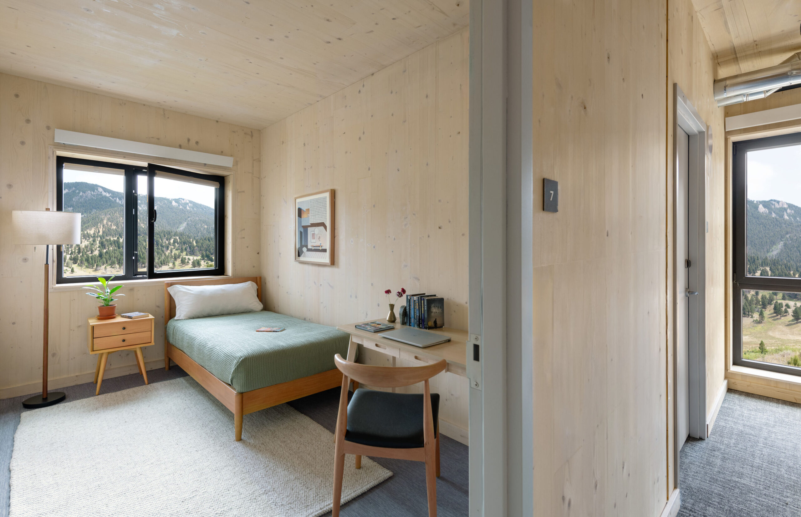 “Most workforce housing is boxes on parking lots,” Rose says. “We wanted this to feel like home—light, privacy, a sense of care.” The project is one of the first large-scale modular mass timber buildings in the United States—a 30,000-square-foot, three-story complex completed under budget in 11 months that can house just under 100 workers. Off-site fabrication of fully finished CLT modules cut labor costs, shortened schedules, and lowered overall expenditures by streamlining on-site assembly. By using mass timber in a modular system, the number of building parts drops by about 80 percent compared to conventional modular construction. And by creating a digital twin of the project, the IDCUBED team was able to coordinate building systems in advance, minimizing unknowns and reducing risk.