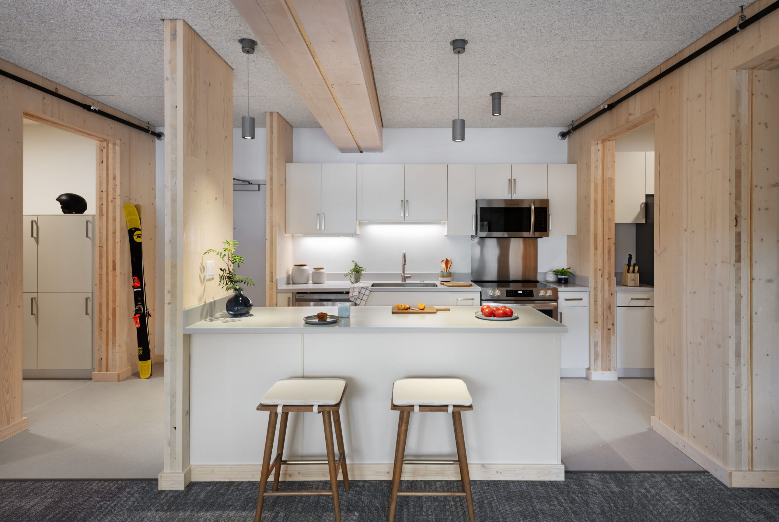 Unlike typical modular factories, which require assembly lines and other expensive equipment, mass timber modular assembly is nimble and cost-effective, making it easy to scale, Rose says. For the Bucks T-4 Housing in Big Sky, IDCUBED designed the modular system while its partner, Kalesnikoff, fabricated the CLT panels and assembled the modules at its facility. The completed units—fully fitted with finishes, cabinetry, and building systems—were then shipped to Montana for rapid on-site installation. “The sophistication is in the design, not the facility,” Rose says.