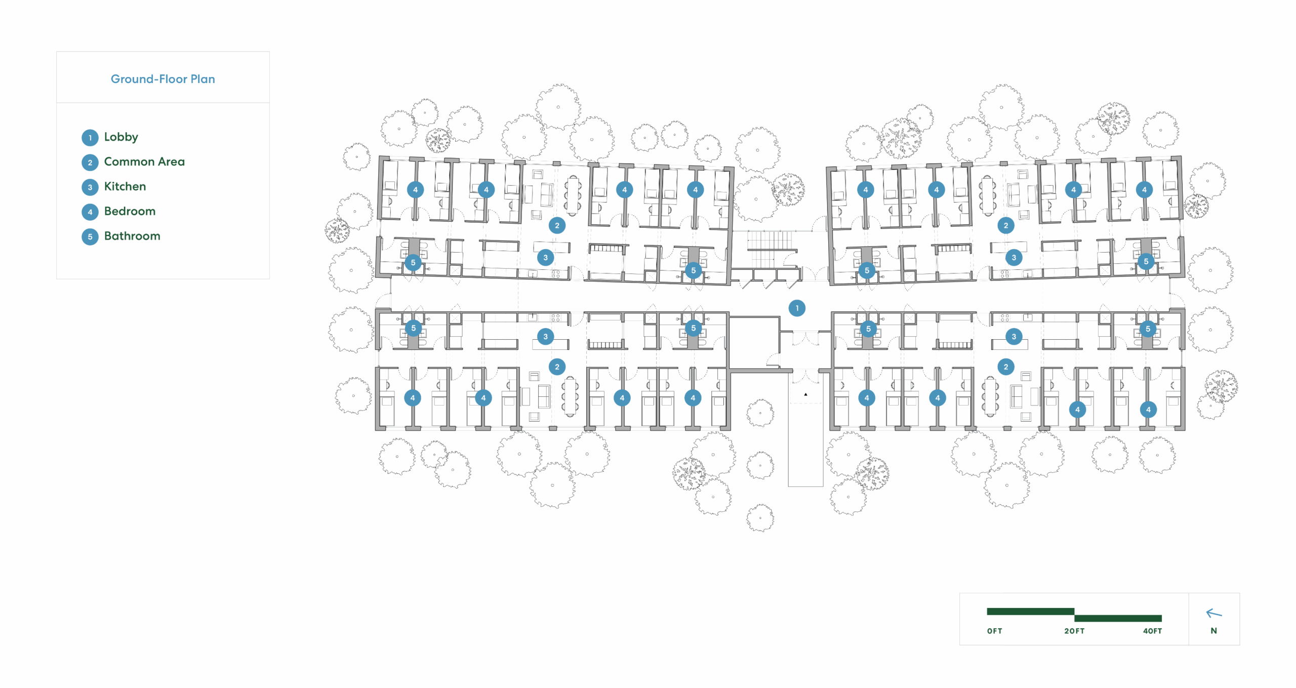 Modules were shipped fully fitted, including plumbing, electrical, acoustic finishes, and windows, requiring only utility hookups and minor finishes onsite. While the original intent was to install cladding panels in the factory, the final decision was to apply Douglas fir siding onsite, simplifying logistics and improving finish quality. All other enclosure elements—insulation, weather barriers, and furring—were applied in the factory.