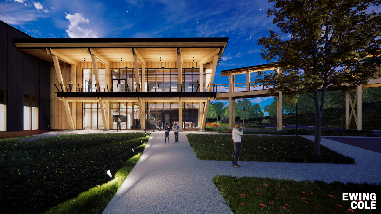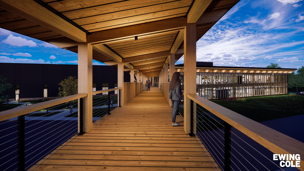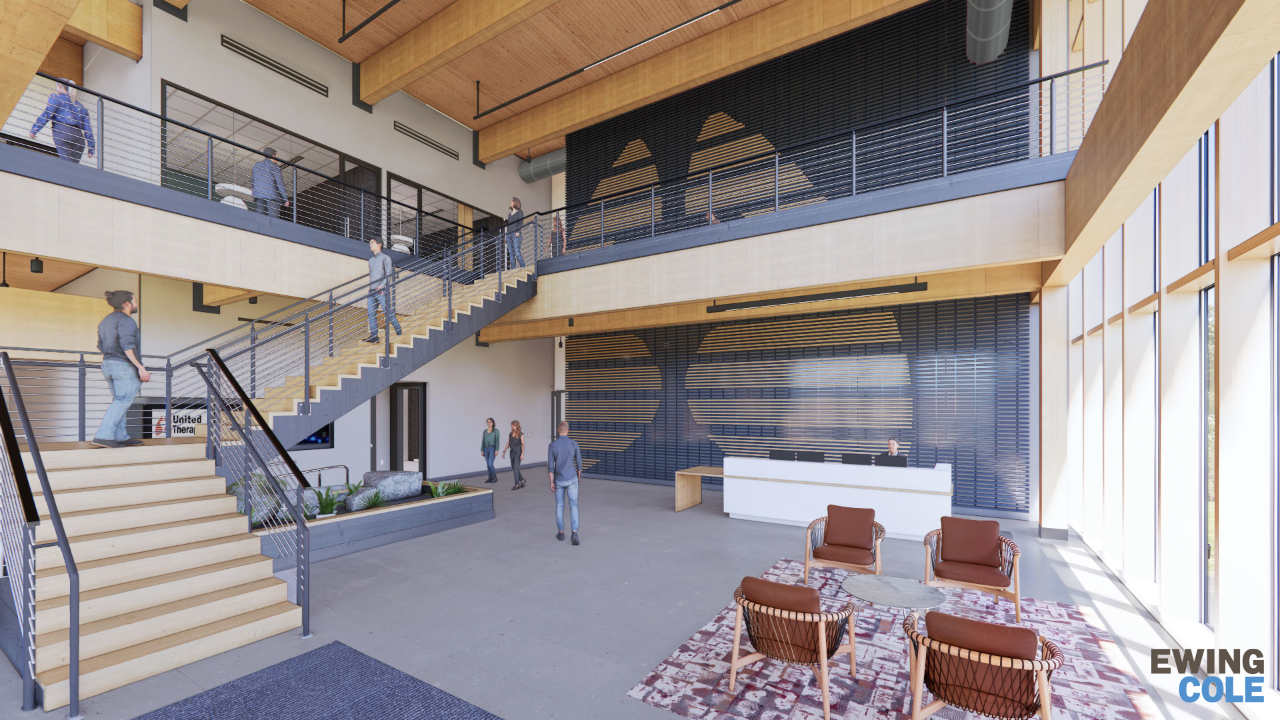 For occupants, the experience of the building is shaped by exposed wood and deliberate connections to the surrounding North Carolina landscape. Staff will enter the facility via an elevated “Tree Walk” platform that leads into a two-story lobby defined by mass timber staircases, branding elements, and structural members left proudly visible. “Even the UT logo and branding are all constructed out of wood elements, really leaning into wood as a primary material of construction,” says Jennifer Wampler, principal at EwingCole and project architect. Beyond the lobby, a two-level office delivers a mix of workstations and private offices lined with mass timber and softened with acoustic baffles.