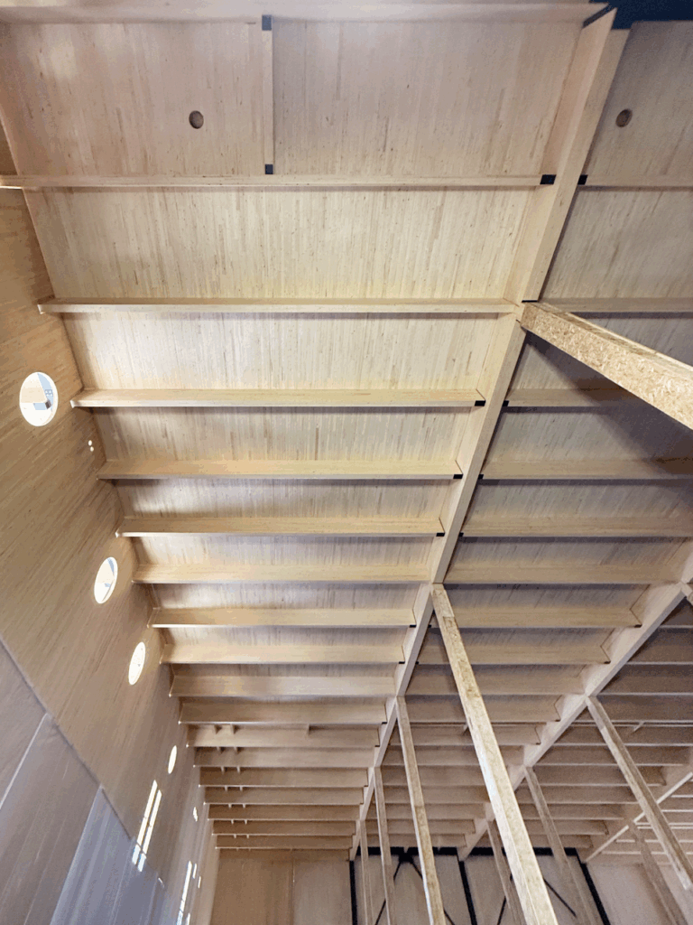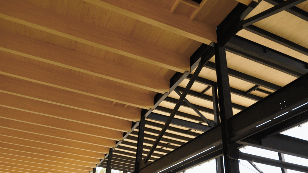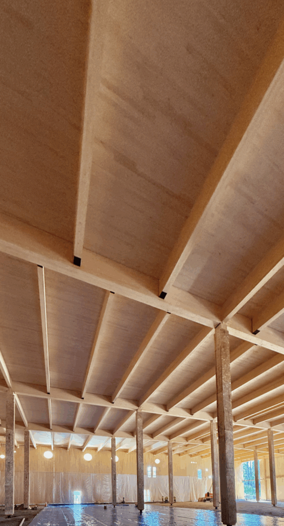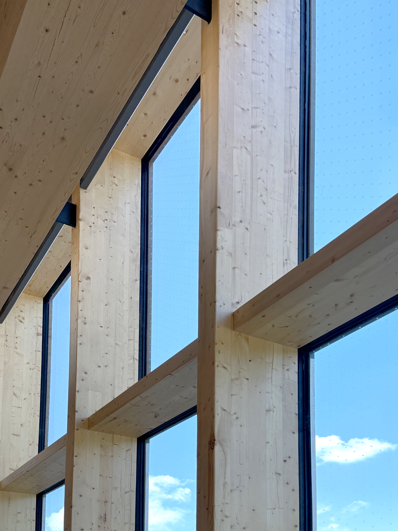 Prefabrication played a crucial role: Nordic Structures CNC-cut openings for services and connections before delivery, allowing the structure to assemble “like a building block set,” as Campbell describes it—enabling faster erection and tighter coordination of connections. The Type V-B construction classification permitted the use of combustible materials in a large-floorplate facility, with fire resistance achieved through member sizing and charring allowances.