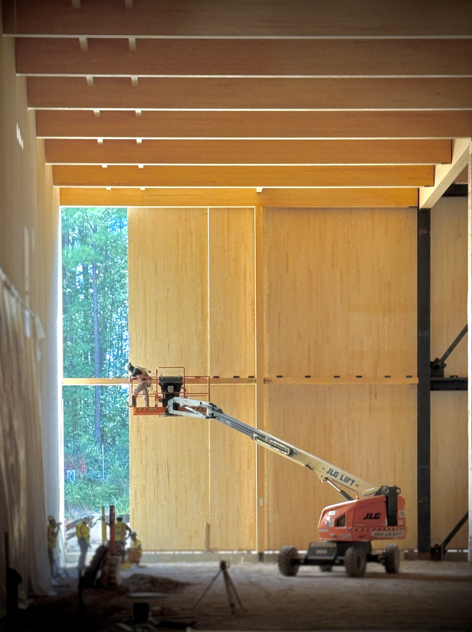 Visitors and employees can see the facility at work while also experiencing the spatial warmth, daylight, and material honesty of wood and its biophilic benefits. “The views from within the manufacturing space are unique,” Wampler says. “Vertical fenestration breaks up the horizontal massing, but more importantly, it connects occupants to the surrounding forested campus—making those outlooks both distinctive and special.”