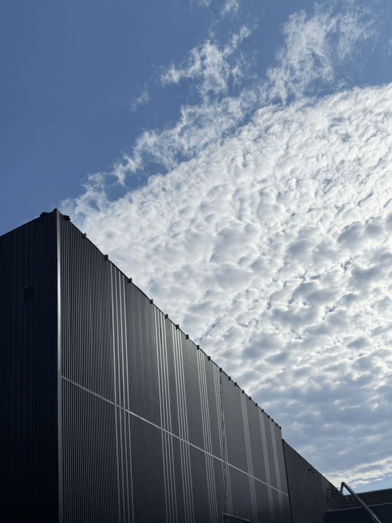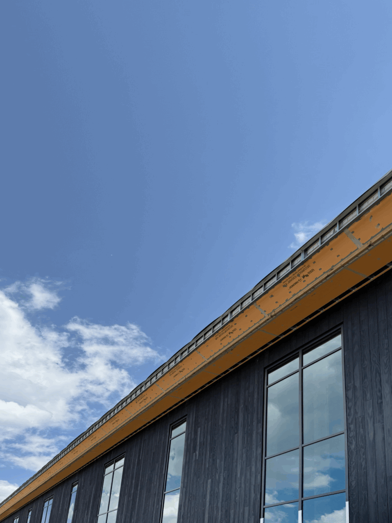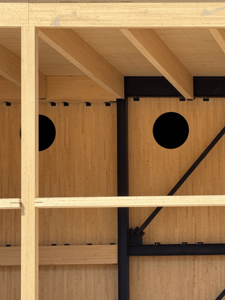 The Warp-10 facility uses a hybrid mass timber structural system to meet those guidelines. Glulam columns and beams form the primary frame, chosen for their strength and ability to handle the long spans required in a manufacturing environment. Cross-laminated timber (CLT) is used for roof and floor decking, as well as wall panels that form the building envelope. Even the curtain wall system that overlays the panels incorporates timber elements, complemented by Shou Sugi Ban siding and bands of Cor-ten steel at the base.